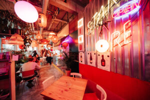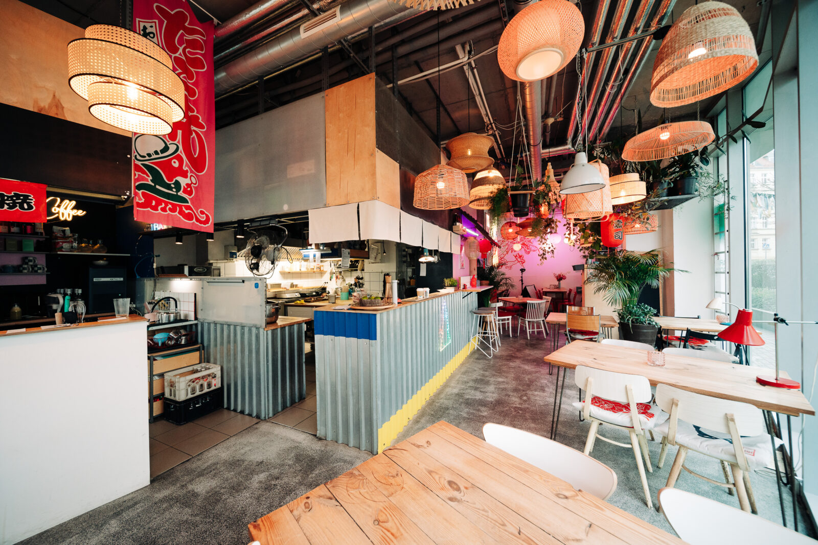 Obszerne wnętrze dzieli się na bar połączony z otwartą kuchnią oraz salę z dużymi drewnianymi stołami dla publiczności. Pod sufitem wiszą kwietniki z zielenią oraz dużo okrągłych żyrandoli. Część to szklane, kolorowe kule, część – rattanowe formy o orientalnym wyrazie. Bar wyłożono blachą falistą, na ścianach wiszą kolorowe jarzeniówki, a stoliki oświetlają małe biurkowe lampy. W ich blasku czekamy z napięciem na pierwsze dania. Jeść się chce!