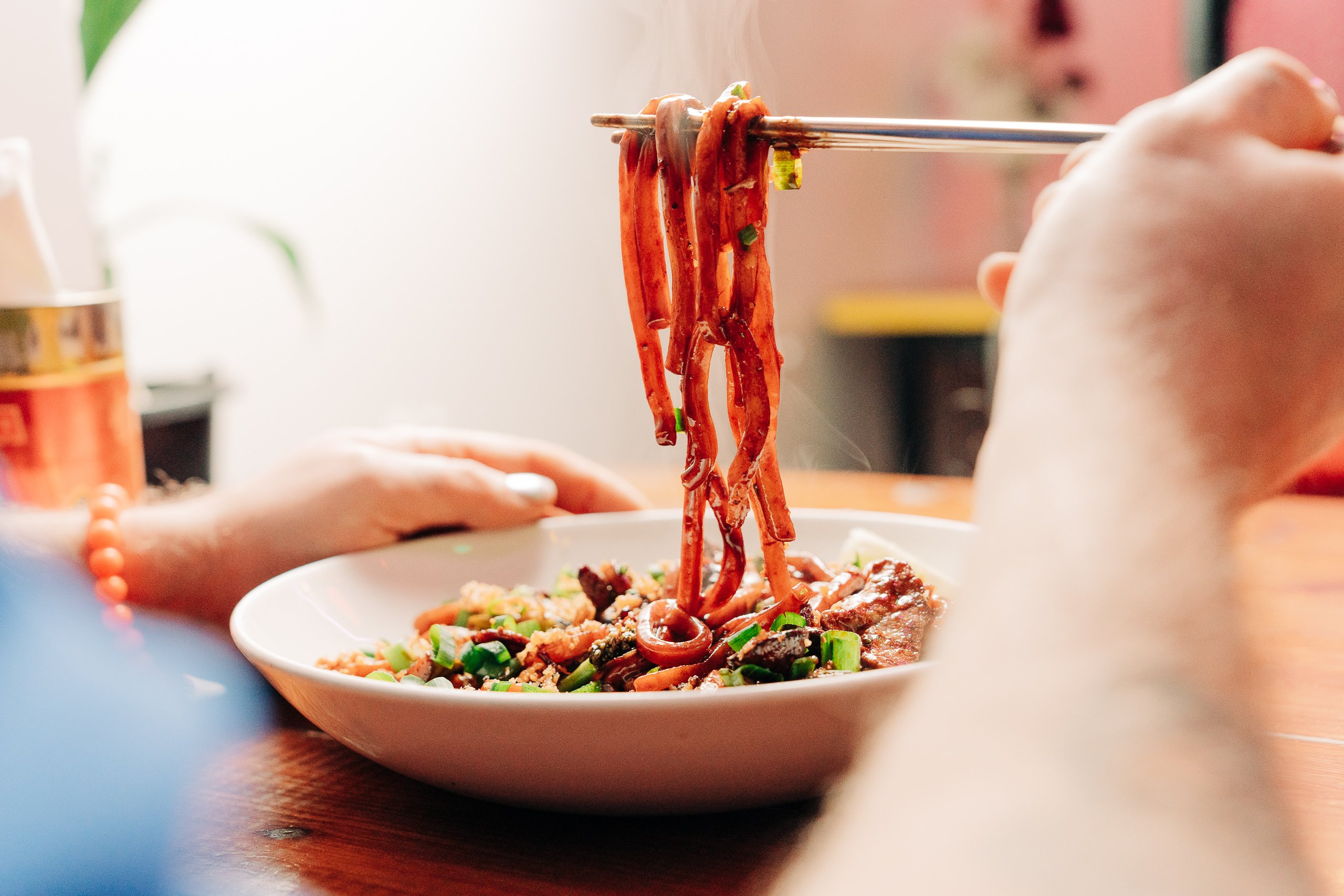 Zaraz potem świetne wrażenie zrobiły udony dwa. Pierwszy, jasny, spoczywał w gęstym, lśniącym, słodkawym wywarze na maśle orzechowym (48 zł). Wspaniały! A dodatkowo zdobiły go kawałki kurzęcej piersi, brokułów, selera naciowego, imbiru, kolendry i sezamu. W karcie istnieje też wersja wegańska z kawałkami tofu (46 zł), więc nikt nie będzie pokrzywdzony. Udon drugi pojawił się w czarnej sukni z pieprzu, pieczarek, ciemnego sosu sojowego i ziółek wszelakich. Do takiej aromatycznej kąpieli można zamówić wołowinę lub seitanową kaczkę (51 zł).