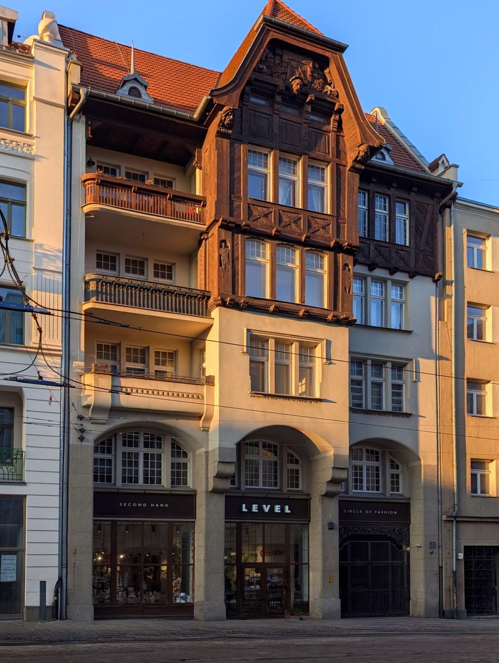 Duet Böhmer i Preul w swoje projekty wpisał charakterystyczne elementy dekoracyjne. Niemal w każdej kamienicy, która wyszła spod ich rąk, zauważymy służące celom dekoracyjnym konstrukcje szkieletowe u szczytów elewacji. Przy Mielżyńskiego 21 panowie poszli o krok dalej. Centralny wykusz oraz boczne osie wykończono bogatym detalem snycerskim, który stworzył Edmund Kunze.