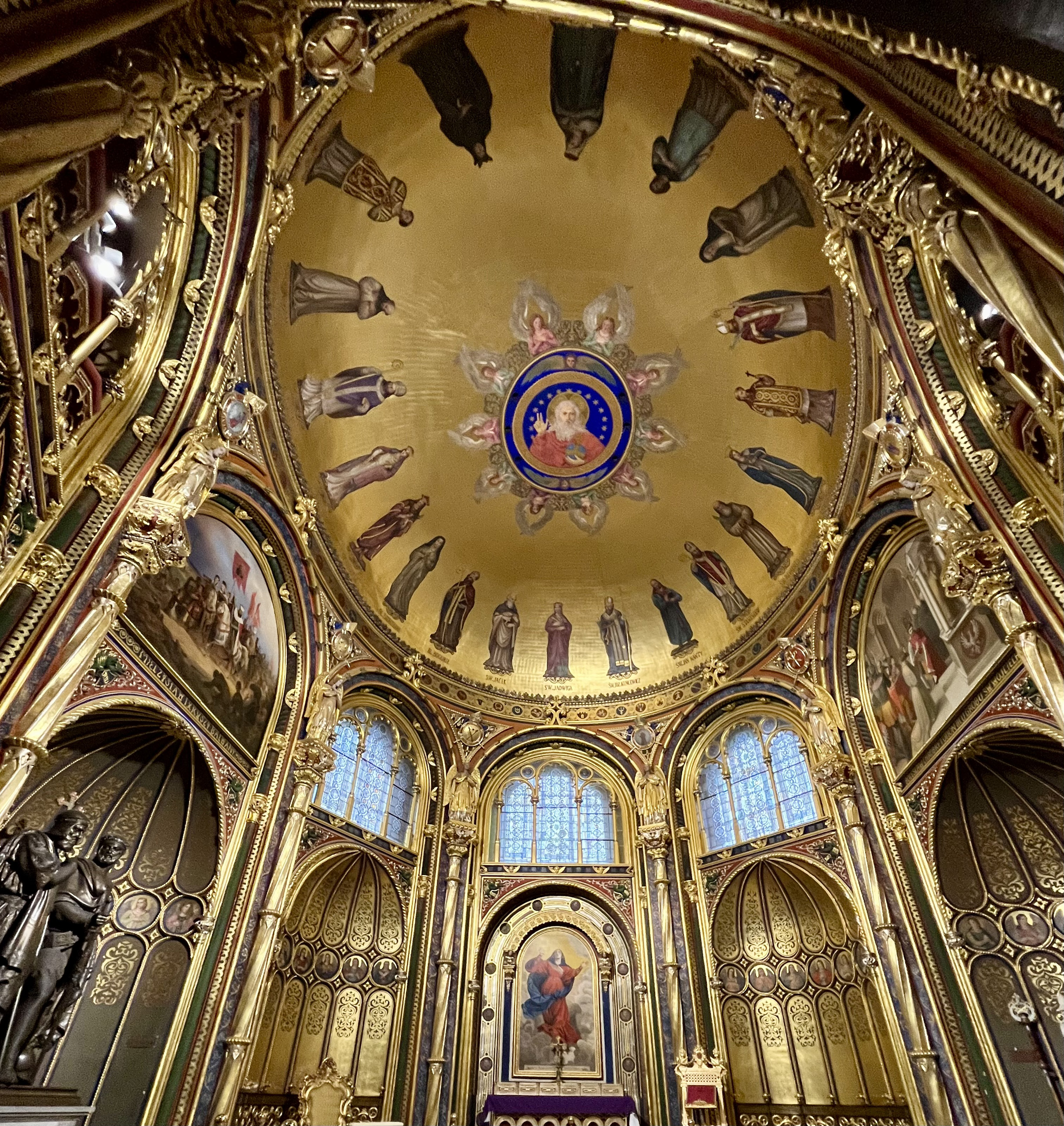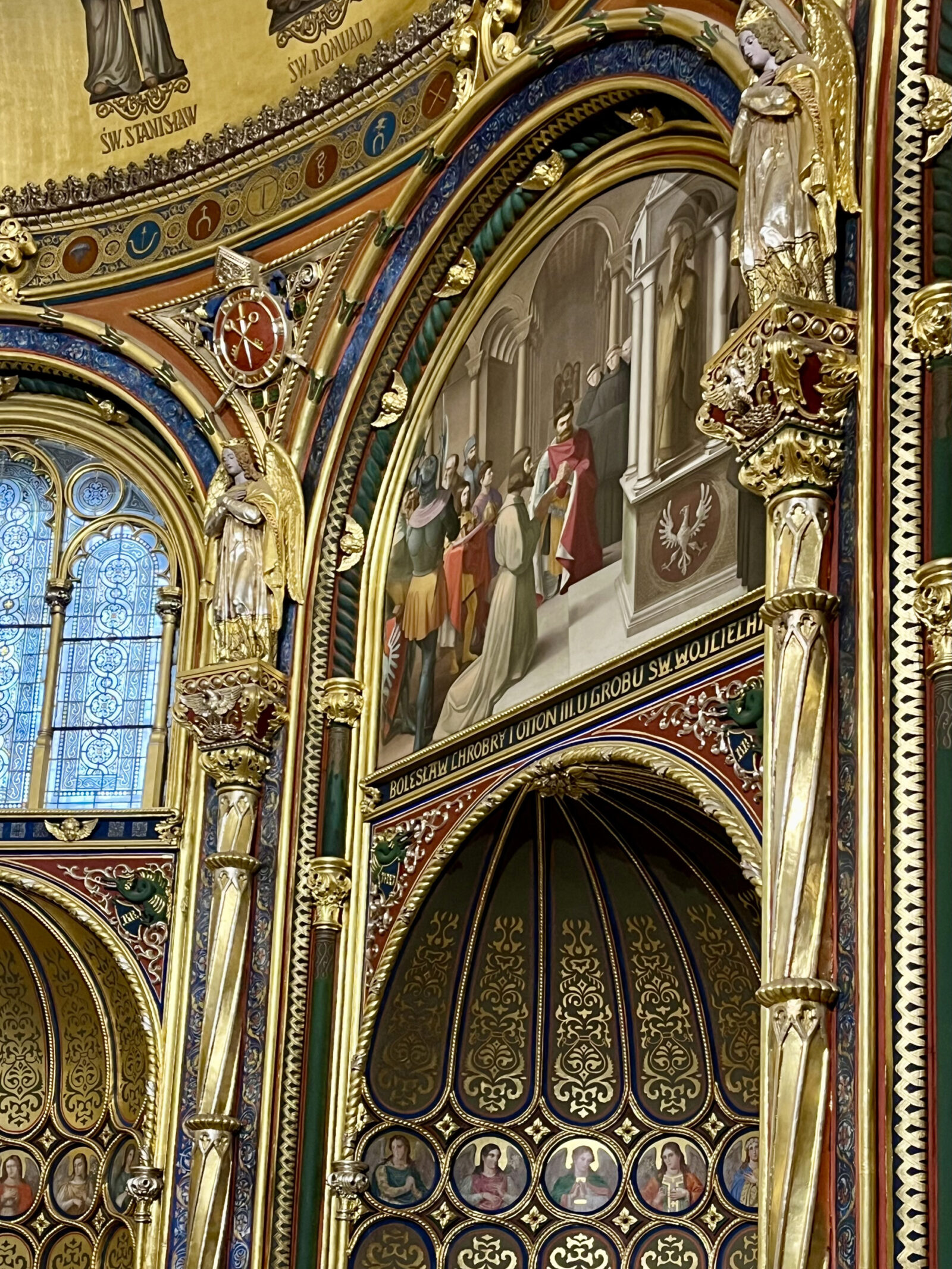 Kaplica, usytuowana osiowo za prezbiterium, nie jest miejscem oczywistym. Gdy do niej docieram i przez kratę oglądam oświetlone za pięć złotych wnętrze (automat nie zmienił się od kiedy byłem tu po raz pierwszy jako dziecko), przypominam sobie słowa anonimowego autora z Przyjaciela Ludu z 1841 roku: „Idź za prezbiterium, uchyl drzwi obitych szkarłatem, a pewien jestem, że zadrżysz z uniesienia”. Podobnie, jak pałacowa kaplica Normanów na Sycylii z XII wieku czy współczesna Raczyńskiemu dworska kaplica Ludwika I w Monachium (pierwowzory poznańskiej fundacji), również nasza kaplica cała lśni od złota. Złote anioły wieńczą złote kolumienki, a te wydzielają zdobione złotymi płycinami nisze. I złote sklepienie z postacią Chrystusa Pantokratora, władcy świata. Jesteśmy we wschodnim, bizantyńskim universum.