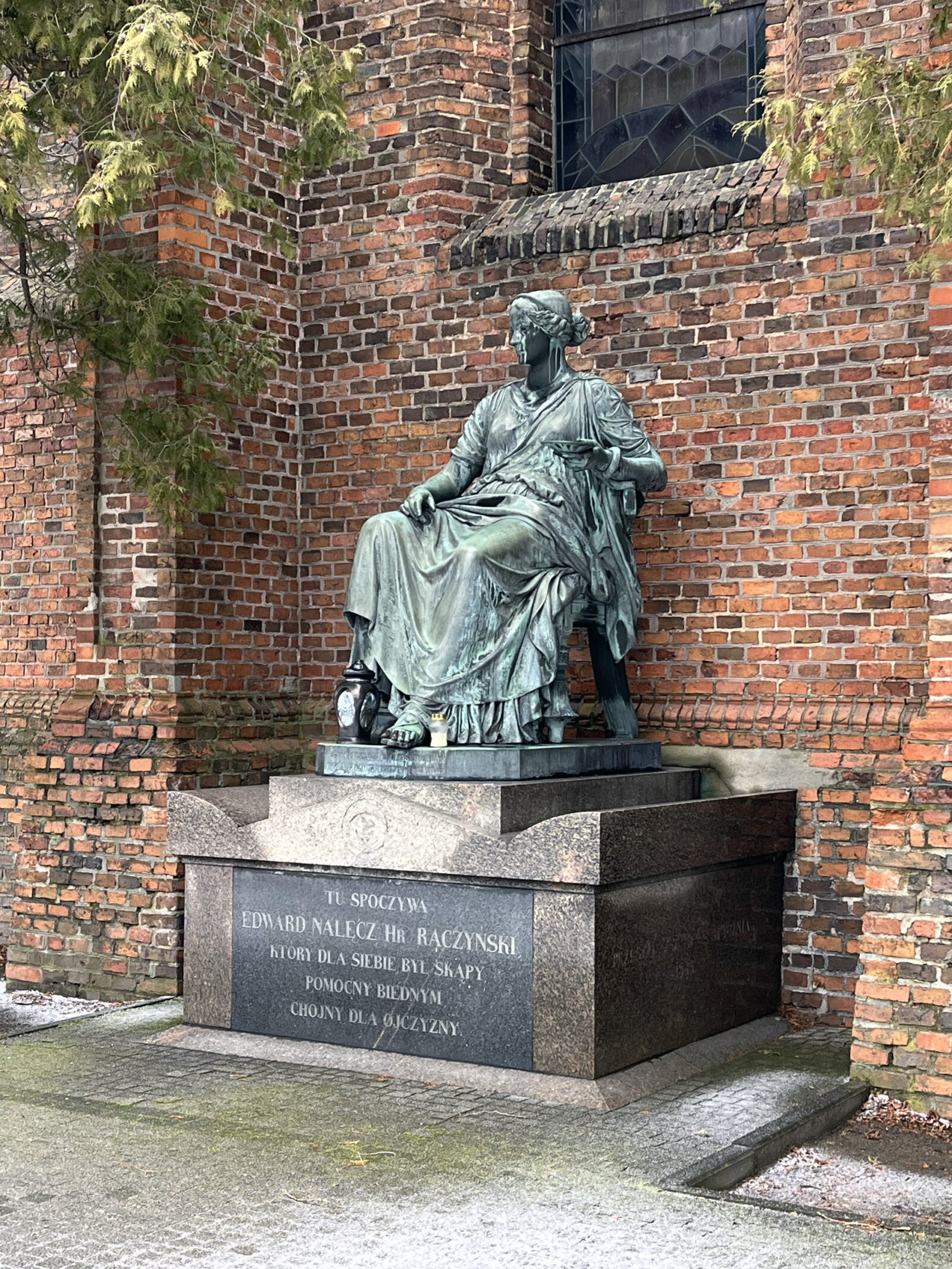 Zgodnie z życzeniem Raczyńskiego, jego zwłoki złożono w grobie wymurowanym przy zachodniej ścianie kościoła parafialnego w Zaniemyślu, a więc poza poświęconą ziemią, w obecności najbliższych mu osób. Jego żona Konstancja na sarkofagu kazała umieścić posąg Higiei, który nosił jej rysy, a który miał zwieńczyć jedną z fundowanych przez Raczyńskiego studzienek w Poznaniu (przed Biblioteką Raczyńskich stoi dziś kopia tego monumentu). Na cokole umieściła napis: „Żona temczasem pilnuje zwłok męża i błaga modlitwy dla niego”. Dotykam stopy Higiei-Konstancji, bo podobno przynosi to szczęście.