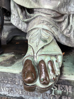 Artysta był tak zadowolony z efektu, że model pomnika już w 1837 roku pokazał na specjalnie zorganizowanej w swoim berlińskim atelier wystawie, którą dzień po zamknięciu oglądał sam król pruski Fryderyk Wilhelm III. Niewielki model monumentu widzimy również na przywołanym wcześniej grupowym portrecie Raczyńskich z 1839 roku. Uznali oni, że warto pokazać dzieło, w które tak bardzo się zaangażowali. Bo też gdyby nie ich żywe kontakty z artystycznymi środowiskami Berlina i samym Rauchem, monument w tak doskonałej postaci zapewne nigdy by nie powstał. Uznając, że jest on jedynie częścią finansowanej ze społecznych składek kaplicy, samemu finansując dzieło Raucha, Edward kazał na cokole wykuć napis: „Ofiarował do tej Kaplicy Edward Nałęcz Raczyński”. O ten napis zaraz potem rozpętała się burza, która doprowadziła do samobójczej śmierci Raczyńskiego.