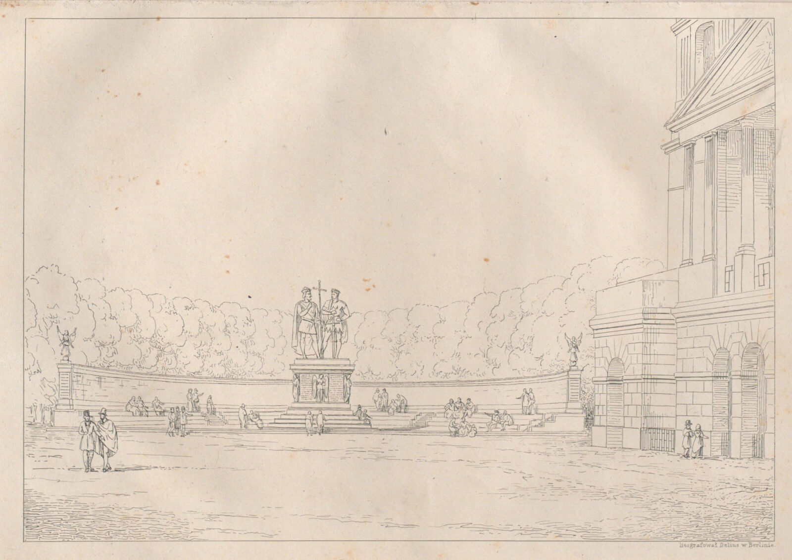 Gdyby zrealizowana została najbardziej monumentalna koncepcja pomnika Mieszka I i Bolesława Chrobrego autorstwa Karla Fridricha Schinkla i Christiana Daniela Raucha, z lewej strony placu katedralnego ujrzelibyśmy półkolisty amfiteatr, tworzący tło dla wyniesionego na piedestale monumentu. W jego cokole planowano nawet umieścić prochy władców wyciągnięte w XVIII wieku ze zrujnowanego katedralnego nagrobka Chrobrego. To właśnie owe prochy, przechowywane w kapitularzu, stały się przyczynkiem dla inicjatywy upamiętnienia z początkiem XIX wieku pierwszych Piastów.