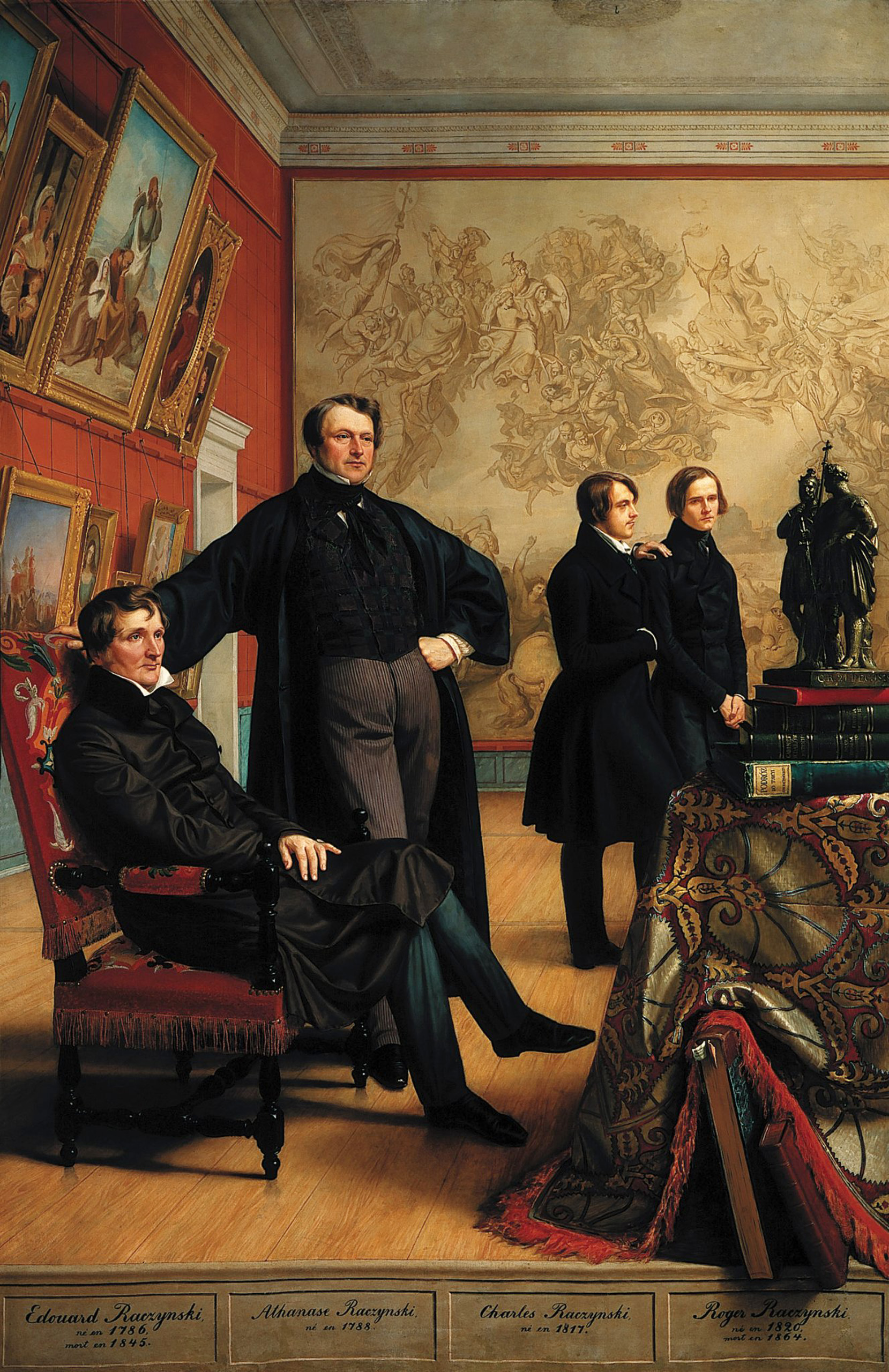 Na słynnym portrecie Raczyńskich z 1839 roku widzimy dojrzałych, pewnych swej pozycji mężczyzn po pięćdziesiątce. Edward siedzi w zdobnym, karmazynowym fotelu, a obok niego stoi brat, po przyjacielsku opierający rękę na fotelowym oparciu. W głębi dwóch młodych mężczyzn – syn Atanazego, Karol i syn Edwarda, Roger. Scena rozgrywa się w efektownym wnętrzu berlińskiej rezydencji Atanazego przy Unter den Linden 21.