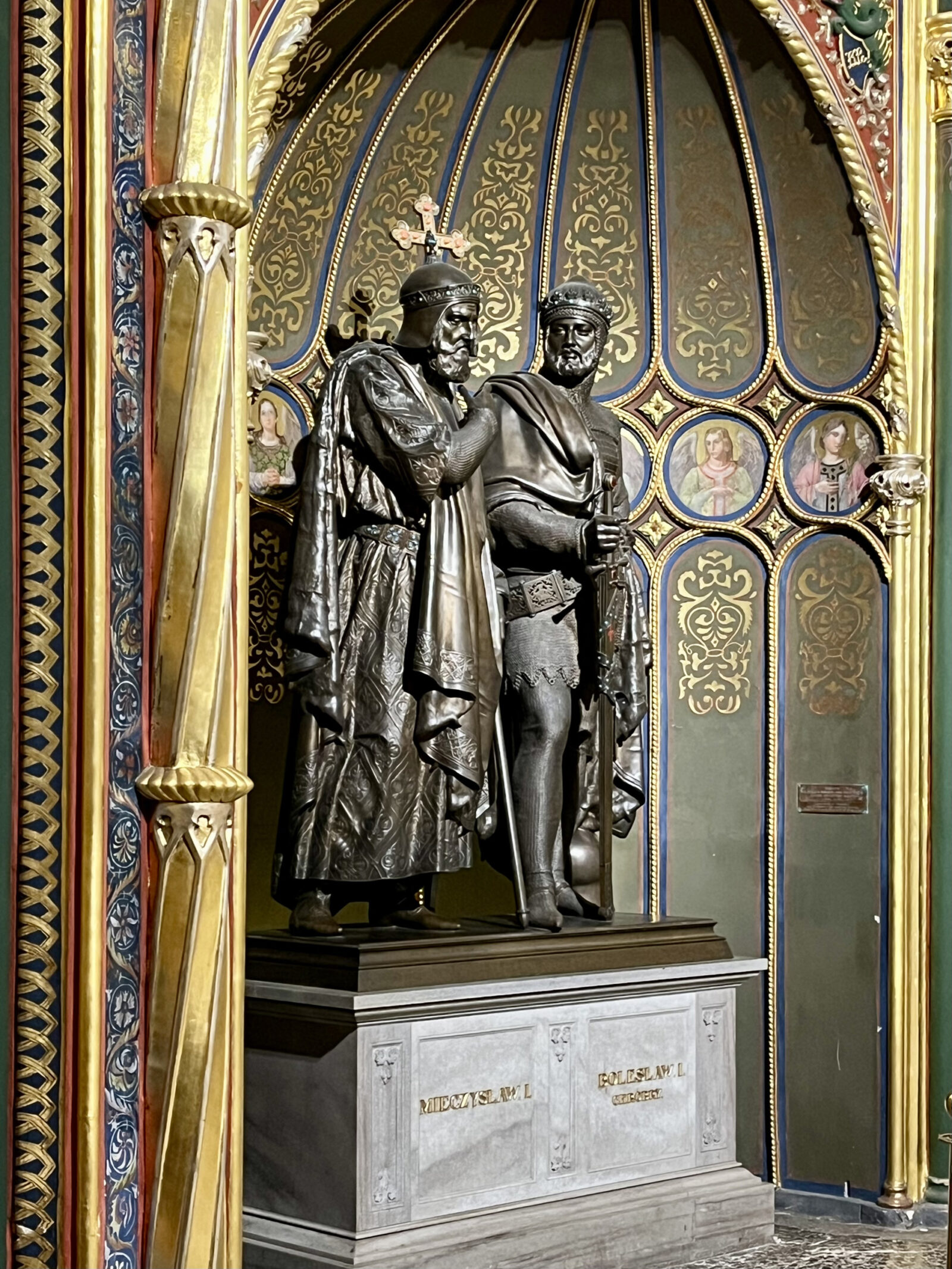 W tym olśniewającym niewątpliwie wnętrzu najważniejsze elementy wepchnięte zostały do nisz. Jest to po jednej stronie neogotycki sarkofag, w którym złożono domniemane szczątki Piastów, a po drugiej, rzeźbiarskie wizerunki Mieszka i Bolesława: księcia-kapłana z krzyżem w ręku i króla-rycerza w zbroi i z mieczem. Wiara i walka – oto fundamenty piastowskiego państwa. Widz zostaje „zgniecony potęgą siły i woli, co tam przez spiżowe Chrobrego tchnie oblicze” – pisał ten sam anonimowy autor. Wielka więc szkoda, że postaci nie stanęły w samym środku wnętrza, tworząc jego absolutną kulminację.