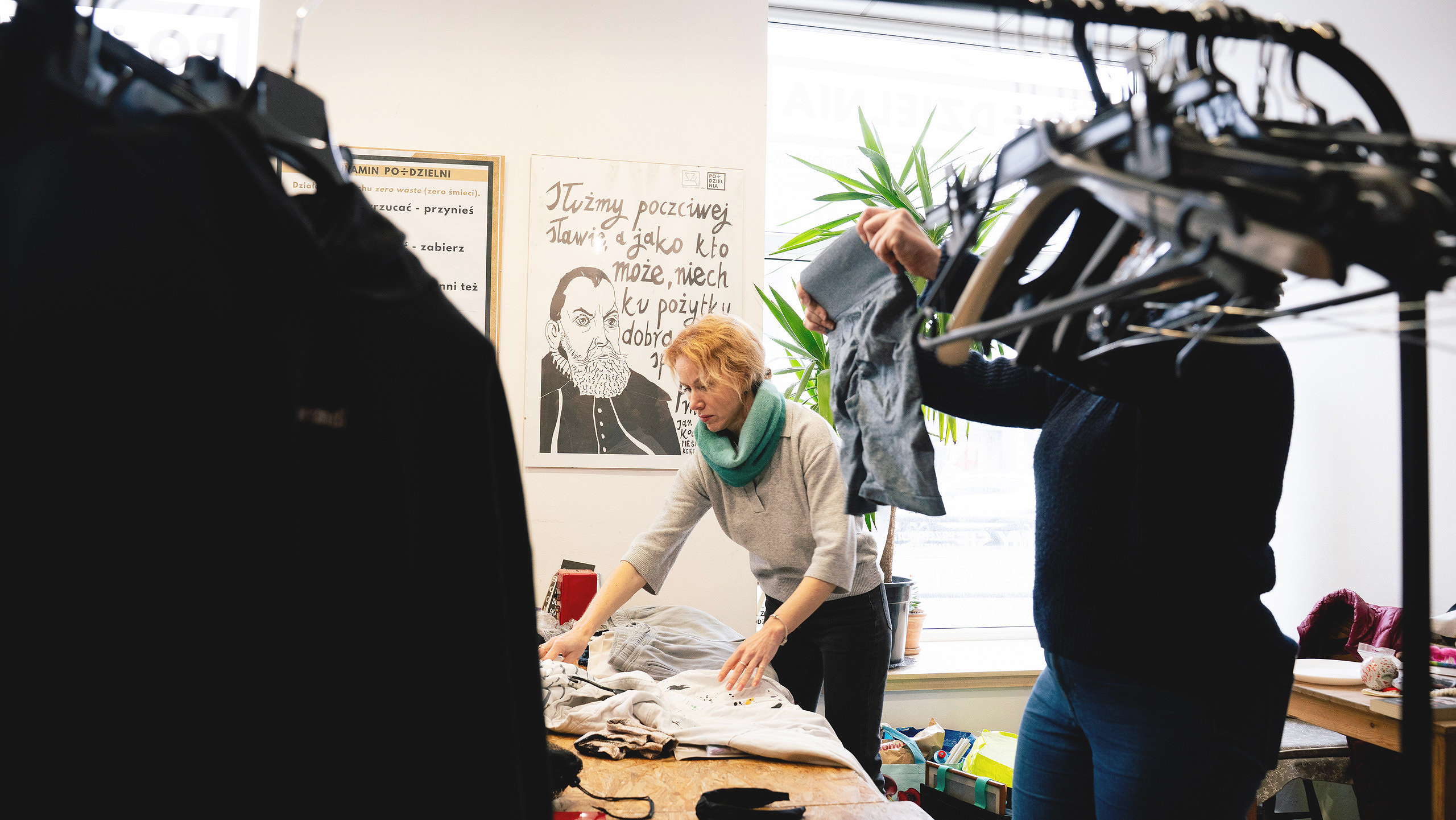 – Można powiedzieć, że Po-Dzielnia jest kobietą, bo jesteśmy ekipą niemal w stu procentach żeńską, złożoną z osób o przeróżnym podłożu społecznym, doświadczeniu zawodowym, wykształceniu i wieku – opowiada moja rozmówczyni. Nie oznacza to, że mężczyźni nie są tu mile widziani, wręcz przeciwnie. Freeshop jest otwarty na pomoc każdemu, a męskie ubrania są tu na wagę złota. – Ciągle apeluję: drodzy mężczyźni, zróbcie czasem czystki w szafach i przynieście do nas to, co niepotrzebne. Na te rzeczy jest ogromne zapotrzebowanie, szczególnie wśród osób z uboższych rodzin, pracujących na świeżym powietrzu lub doświadczających kryzysu bezdomności – tłumaczy pomysłodawczyni projektu.