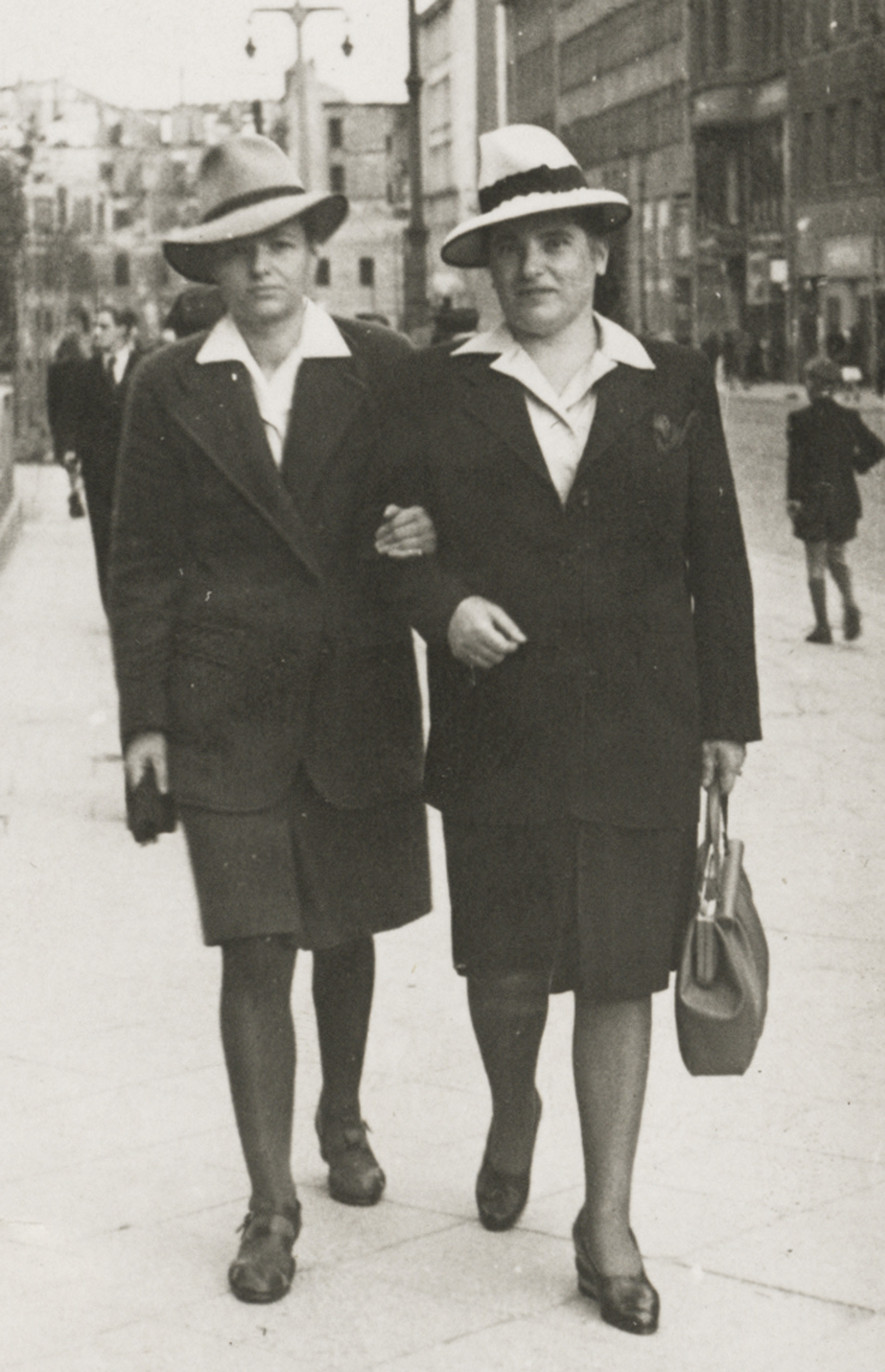 Maria Rataj (z prawej) na tle spalonego Bazaru w Poznaniu, 1945 | foto Dom Literatury Biblioteki Raczyńskich