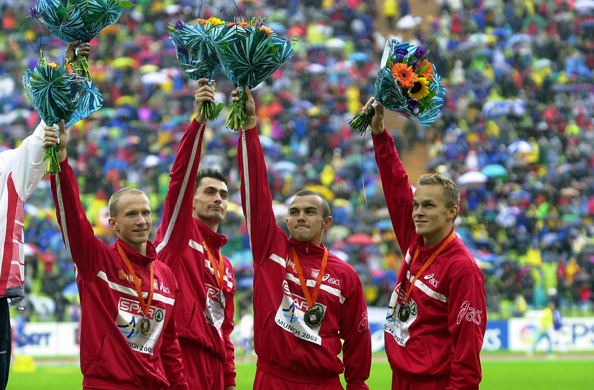 Polska sztafeta 4×100 m z brązowym medalem Mistrzostw Europy w Monachium 2002 – z prawej Marcin Urbaś | foto arch. Marcina Urbasia