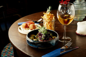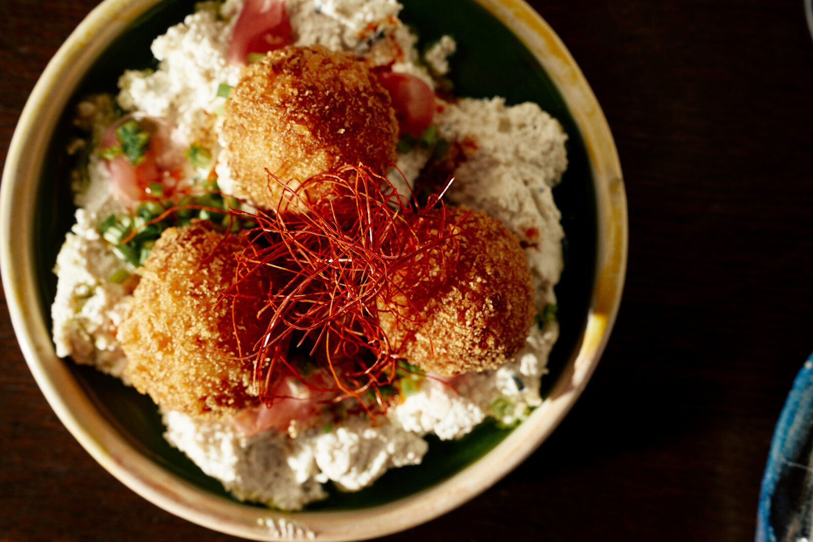 Kontynuujemy transkulturowe doświadczenie naukowe i na stole pojawiają się pyrancini (37 zł), czyli wielkopolska wersja hiszpańskich arancini. Kule z puree ziemniaczanego, panierowane w panko i rzucone na talerz z gzikiem, to oryginalny upgrade i synteza lokalnego przysmaku. Dla mnie się podoba! Szczególnie, gdy do zabawy dołączy grubo siekany tatar z polędwicy wołowej, małosolne kurki, żel z żółtek, marynowana cebulka i cieniutki, podsmażony na chrupko julienne z pora (54 zł). Tak się żyje, tak się żyje w Poznaniu!