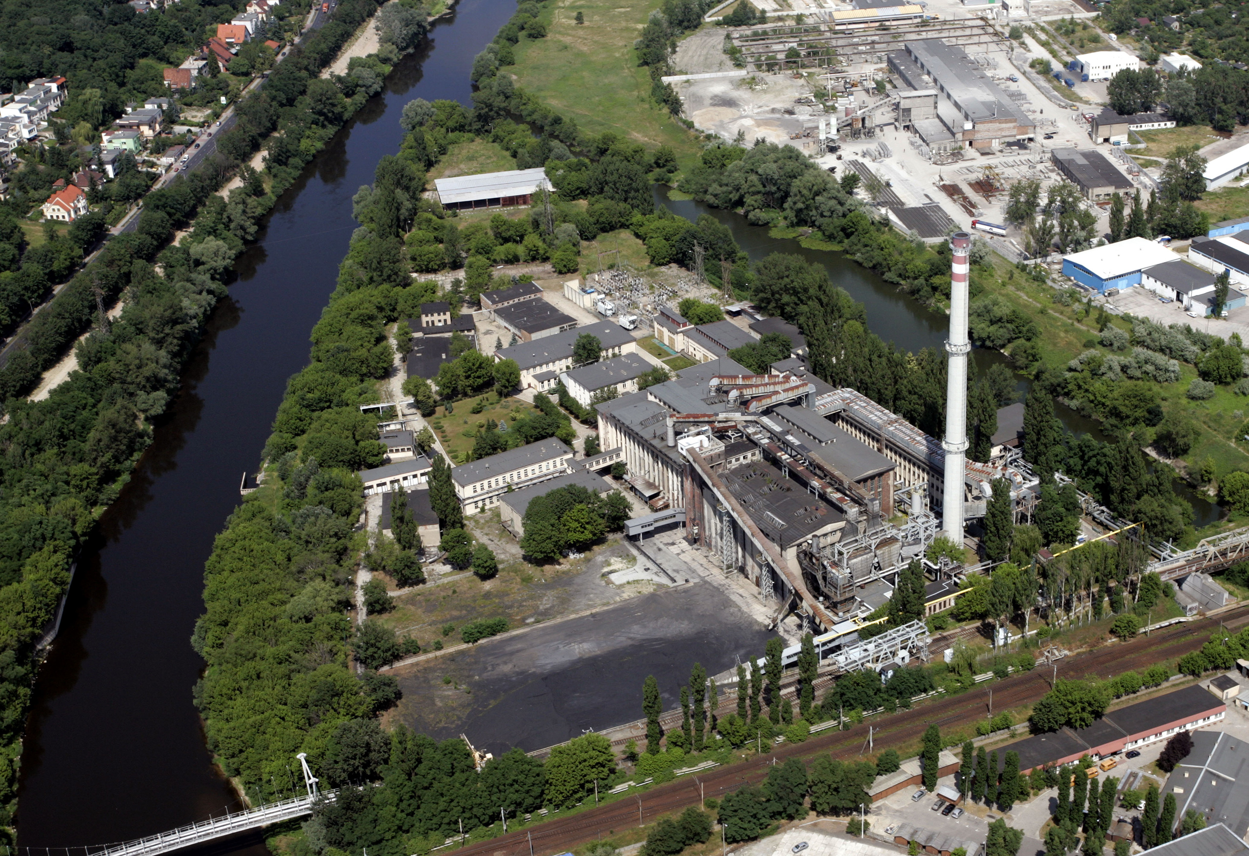 Ostrów Tumski, część północna z działającą jeszcze elektrociepłownią i jej wysokim kominem (stan po powojennych rozbudowach, obecnie zredukowany do części zabytkowej czeka na zabudowę domami mieszkalnymi), po prawej u góry, za kanałem ulgi – wytwórnia prefabrykatów (dziś baza firmy komunalnej), po lewej – ul. Szelągowska, czerwiec 2007. | foto Andrzej Szozda | Fundacja Rozwoju Miasta Poznania | cyryl.poznan.pl