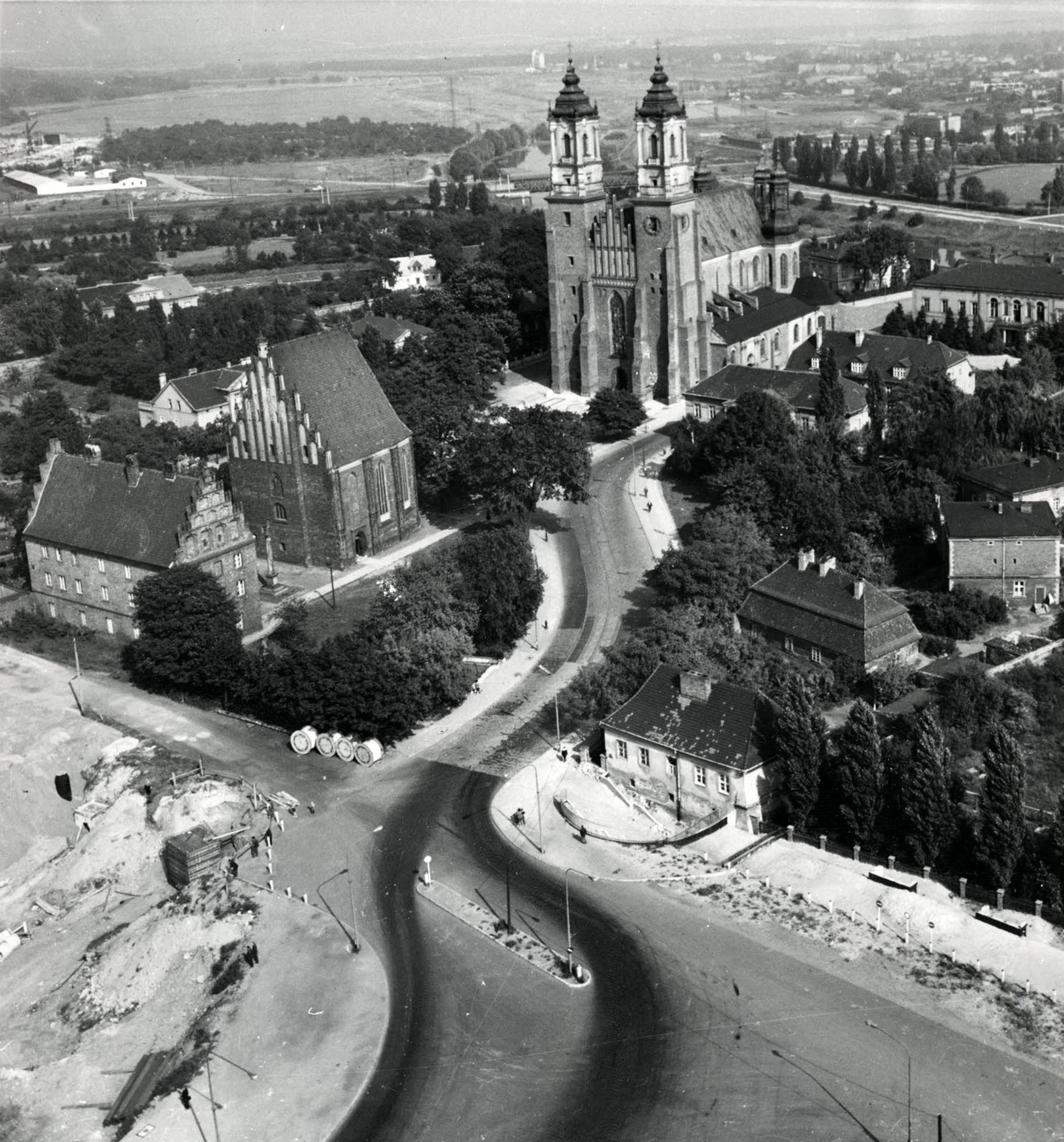 Ostrów Tumski po wybudowaniu nowego Mostu Chrobrego (otwartego w grudniu 1964 r.), ogrody arcybiskupie (po prawej) jeszcze nierozcięte trasą chwaliszewską. Zdjęcie wykonano 10 września 1965 r. | foto Janusz Korpal | Biuro Miejskiego Konserwatora Zabytków w Poznaniu | cyryl.poznan.pl