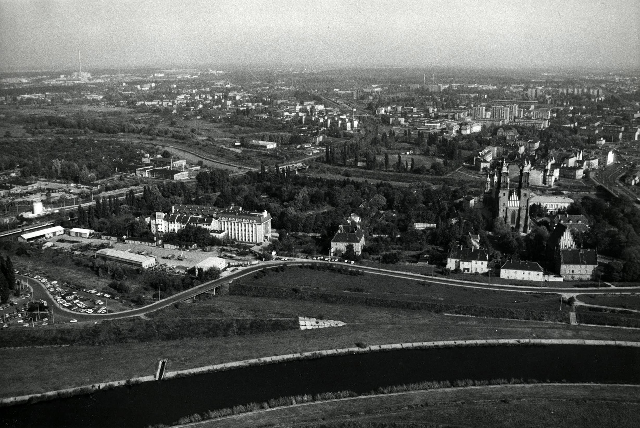 Ostrów Tumski, stan po przekształceniach z lat 60. i 70. XX w., po prawej u góry północna część wyspy z ogrodami działkowymi i zakładem pralniczym, na pierwszym planie seminarium dla zagranicy po rozbudowie z lat 70. i 80. Zdjęcie wykonano w 1993 roku. | foto B. Cynalewski | Biuro Miejskiego Konserwatora Zabytków w Poznaniu | cyryl.poznan.pl