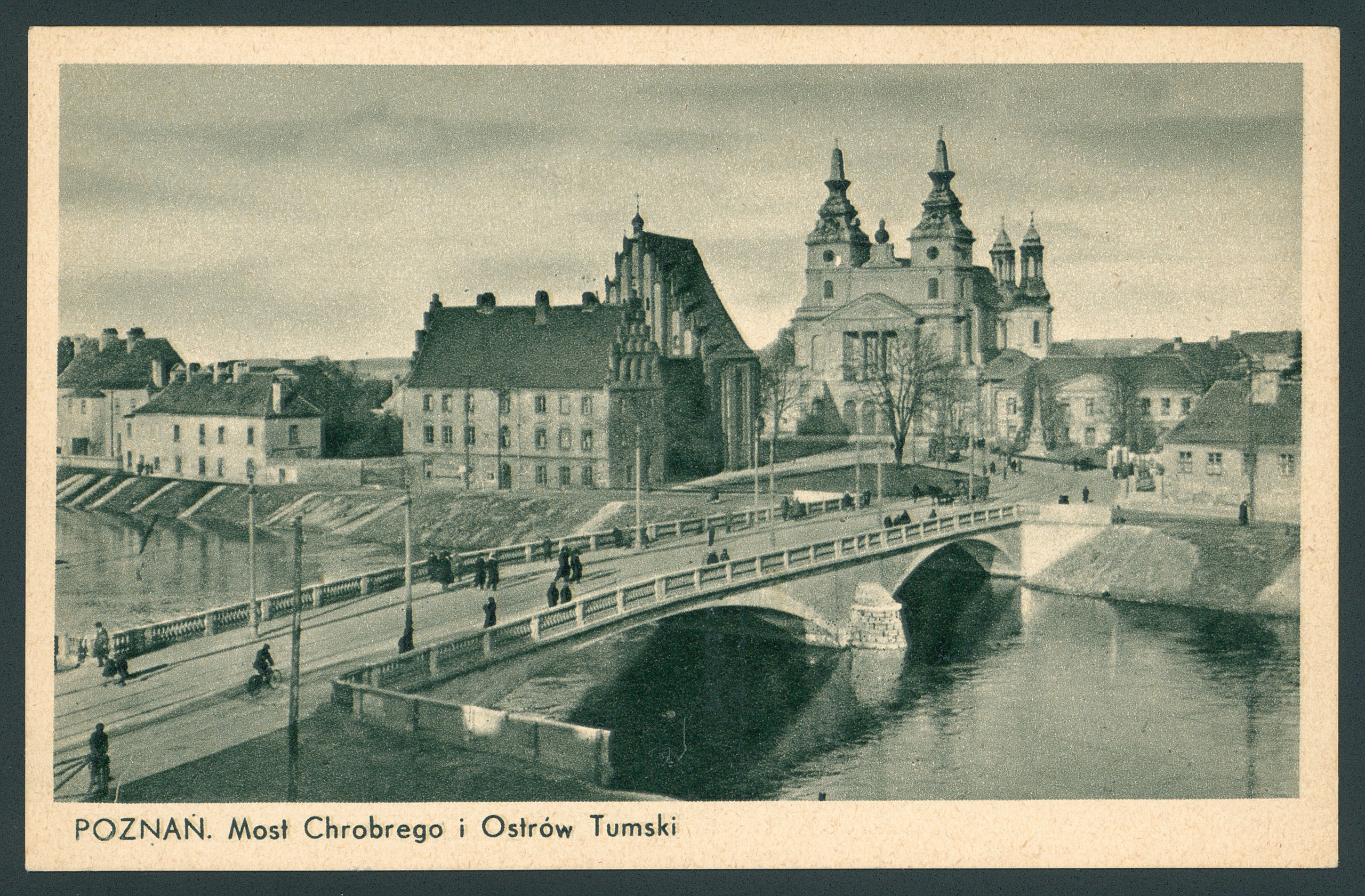 Ostrów Tumski między 1925 a 1939 rokiem, widoczny dwuprzęsłowy Most Chrobrego autorstwa Lucjana Ballenstedta przerzucony nad ówczesnym kanałem ulgi. | autor nieznany | Wikimedia Commons, domena publiczna | polona.pl