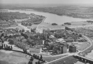 Ostrów Tumski, stan po przekształceniach z lat 60. i 70. XX w., po prawej u góry północna część wyspy z ogrodami działkowymi i zakładem pralniczym, na pierwszym planie seminarium dla zagranicy po rozbudowie z lat 70. i 80. Zdjęcie wykonano w 1993 roku. | foto B. Cynalewski | Biuro Miejskiego Konserwatora Zabytków w Poznaniu | cyryl.poznan.pl