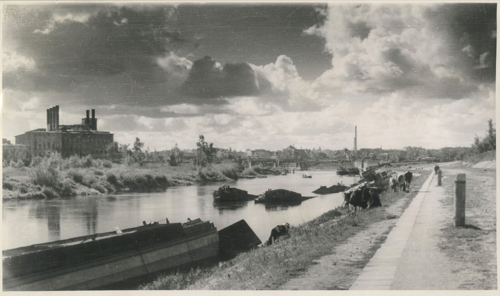 Ostrów Tumski, część północna z działającą jeszcze elektrociepłownią i jej wysokim kominem (stan po powojennych rozbudowach, obecnie zredukowany do części zabytkowej czeka na zabudowę domami mieszkalnymi), po prawej u góry, za kanałem ulgi – wytwórnia prefabrykatów (dziś baza firmy komunalnej), po lewej – ul. Szelągowska, czerwiec 2007. | foto Andrzej Szozda | Fundacja Rozwoju Miasta Poznania | cyryl.poznan.pl