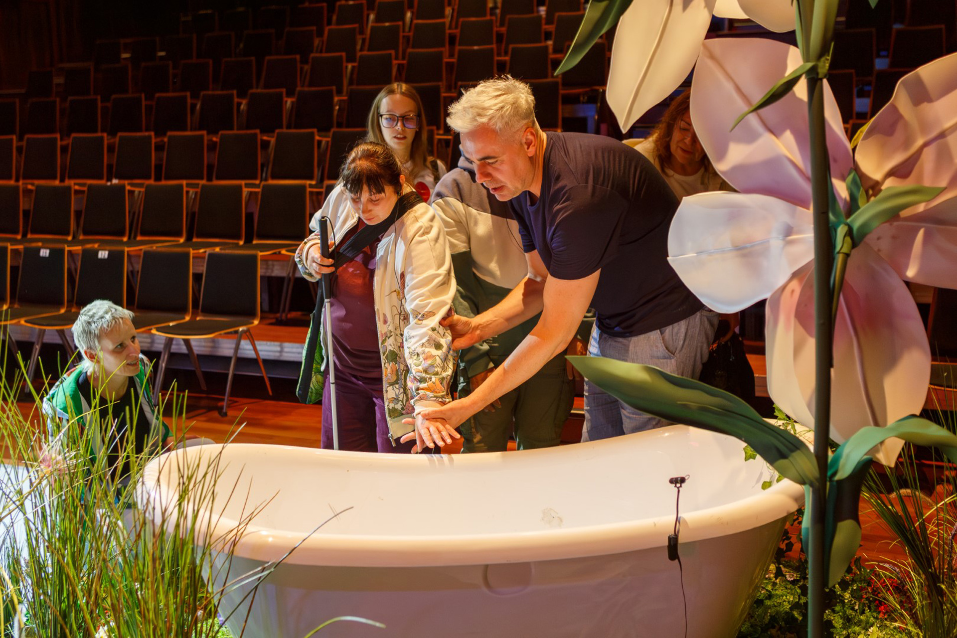Kadr z oprowadzania dotykowego po scenie przed spektaklem „Libido romantico” Teatru 21, prezentowanym w CK ZAMEK 15.09.2025; oprowadzał Marcin Głowiński | foto Maciej Kaczyński | CK ZAMEK