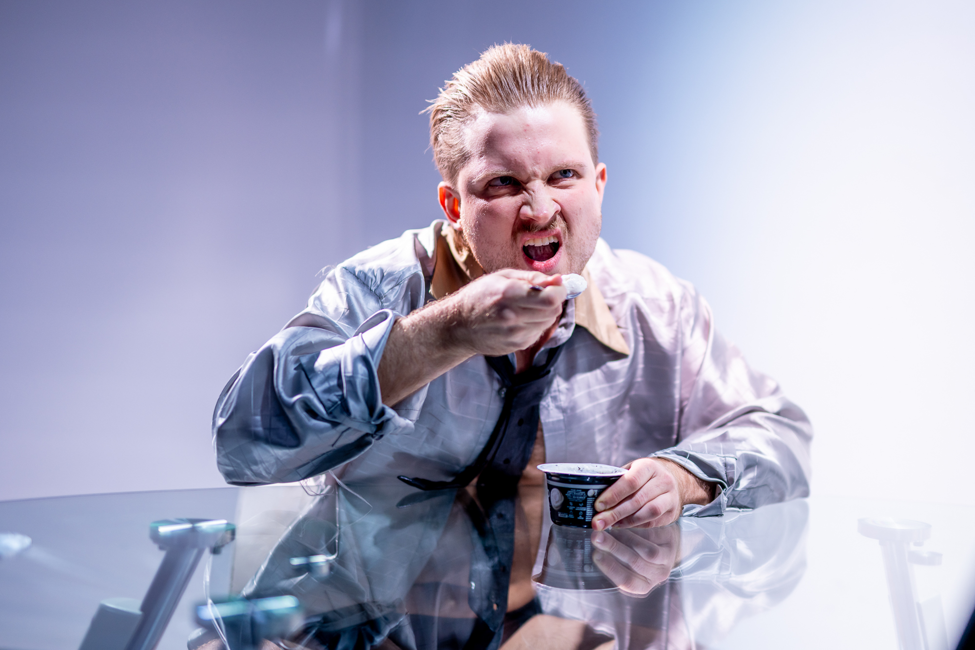 Wróćmy jednak do Edmunda. Jego zmaganie się z męskością, które oglądamy na Scenie Roboczej w warunkach sterylnie niemal laboratoryjnych, jest przede wszystkim potyczką ze społeczno-kulturowym konstruktem faceta (siedzieć po męsku, jeść po męsku, witać się po męsku etc.), ale mnie najbardziej zaciekawiło w tej opowieści nieustanne siłowanie się Edmunda z samym sobą, tym bardziej, że uchodzi on chyba dość powszechnie, za „tranzycyjny sukces”. Jest przecież na pierwszy rzut oka typem manly man, wygląda wręcz jak z plakatu początkujących kulturystów z lat 80. (ten wąs!). Jednak mimo tej spektakularnej metamorfozy, z jego życia nie chce zniknąć coś, co historycy sztuki nazywają widzeniem widzącym. W tym przypadku to precyzyjne i głębokie widzenie własnych „niedostatków” (przyglądanie się z bliska małym dłoniom) oraz ciągłe oglądanie twarzy pod szkłem powiększającym, co wydaje się zupełnie wykańczające i każde zadać pytanie, czy to się kiedyś skończy?